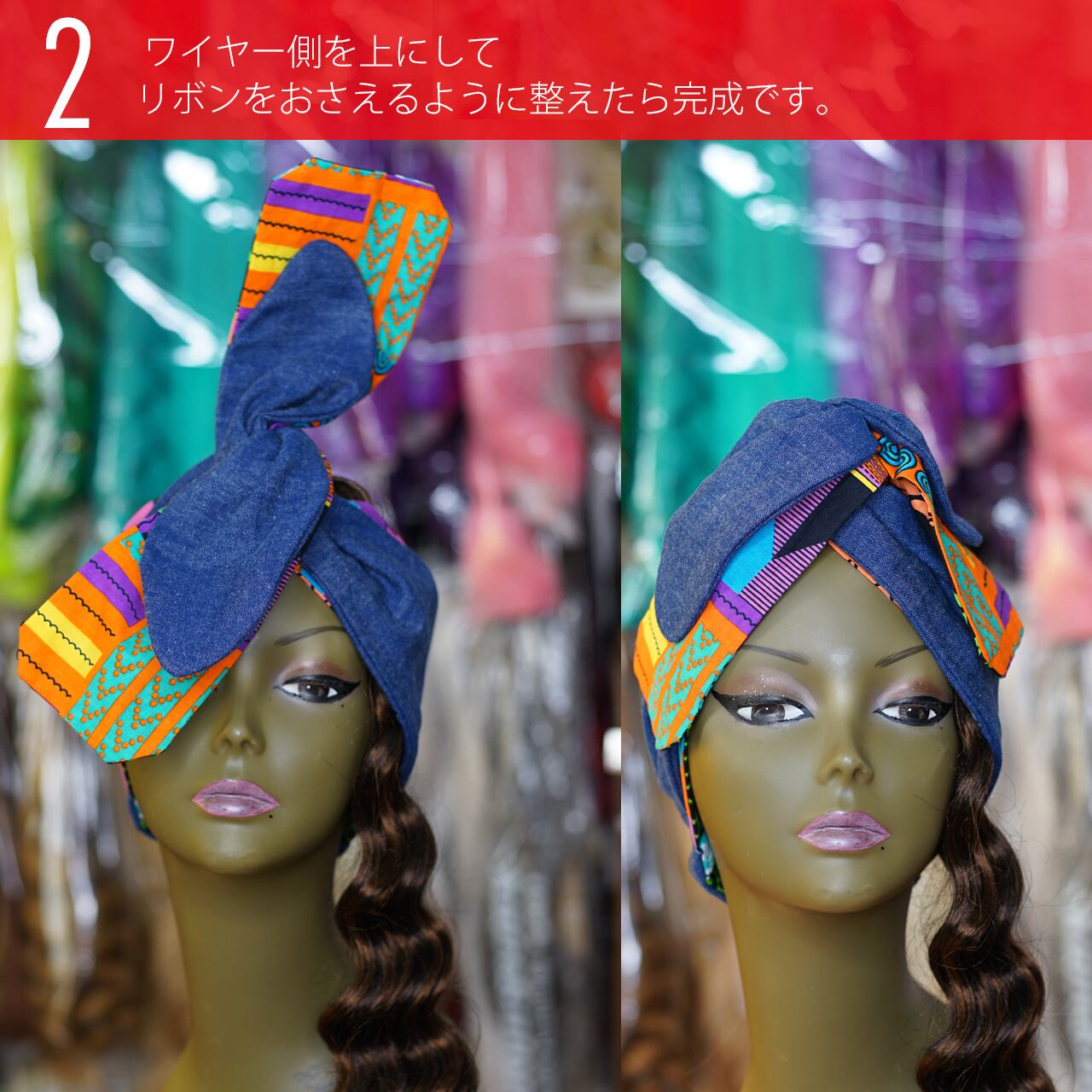 W111【アフリカ布のヘアバンド】ワイヤー&ムスビ リボン W / リバーシブル